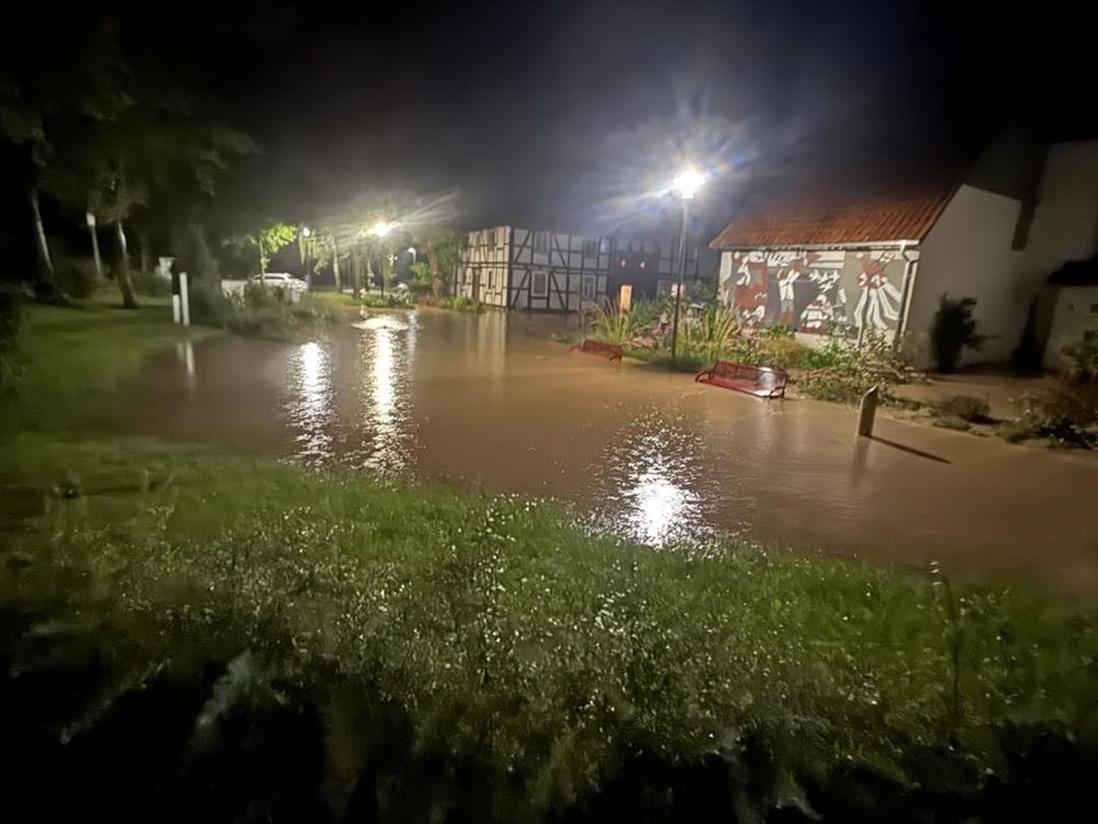 Insbesondere in der Ortsmitte und auf der Schere, wo die Alster über die Ufer getreten ist, aber auch auf den Straßen von Manrode und Haarbrück kommend führen hohe Wassermassen zu Überschwemmungen.